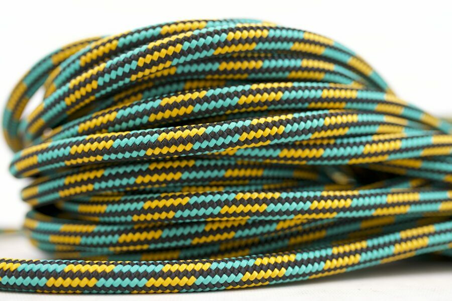 Description: Sawtooth - 11.7mm 24 strand double braid ropes. A polyester cover over a braided polyester core. Teal, Gold and Black make for a distinctive and cool looking rope . Engineered for use with both moving and stationary rope systems. Works well with hardware. Offers excellent hand, is durable, and is perfect for long ascents. It’s an excellent rope for climbers of all skill levels. Meets the ANSI Z133