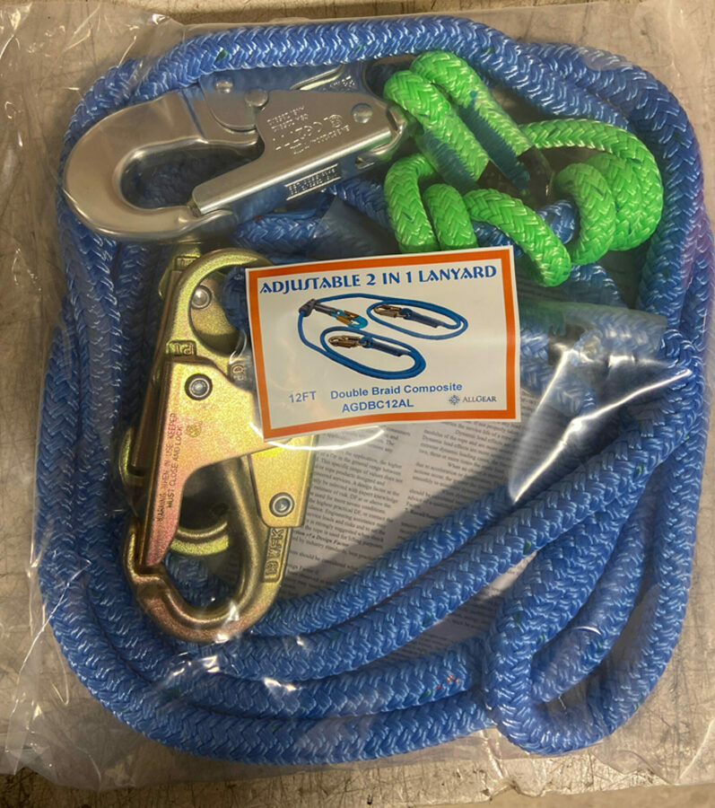 Description: All Gear's 2 in 1 Adjustable Safety Lanyard is a 1/2" Husky Bull Rope Line with Two Steel Double Locking Snap Hooks. Quality engineering and construction are guaranteed by excellent quality control.