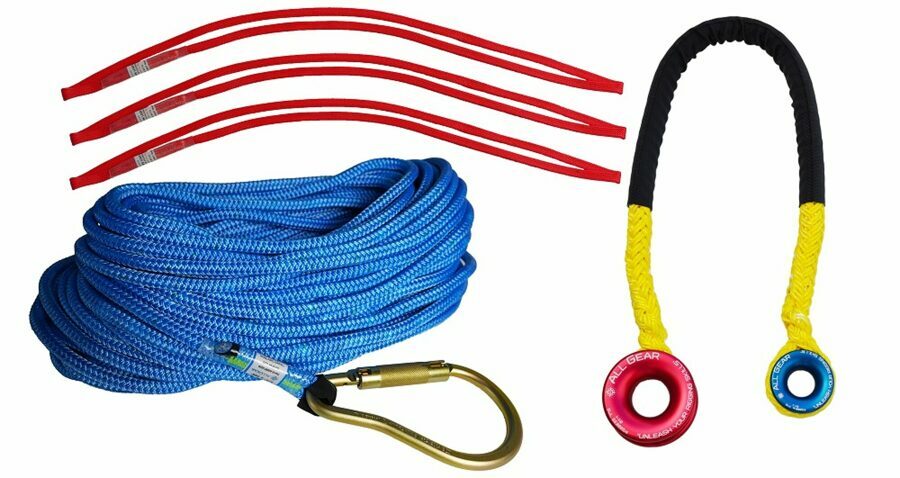 Description: ALL GEAR Knotless Rigging Kit B includes one 1/2 inch x 150 foot Husky Bull Rope with Sewn Eye Coated in our Husky Urethane Coating 10,000 lbs Average Break Strength, One Pear Shaped Carabiner, Three 1/2' x 36''HMPE Rigging Loops and One 5/8'x 40 inch Ring to Ring Sling