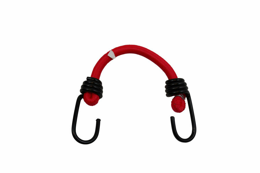 Description: ALL GEAR Shock Cord with Plastic Coated Heavy Duty Metal J Hooks 1/2 inch Diameter x 12, 18, 24, 36, 40, 48, 60 and 72 inch in Length. Red with Black Hooks. Heavy duty red shock cord assemblies. Warning tags attached to each unit.