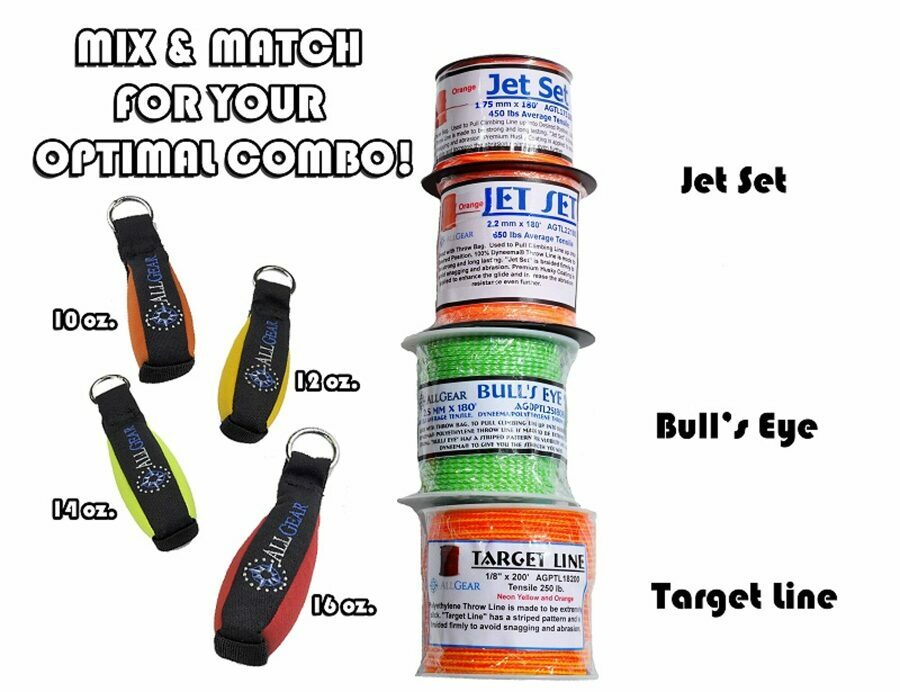 Description: ALL GEAR Throw Line and Throw Bag Packages Bulls Eye - High Visibility, Rot Resistant, 50 percent Polyethylene with 50 percent High Strength HMPE, Good Memory for Recoiling 10 oz Orange, 12 oz Yellow, 14 oz Green, 16 oz Red