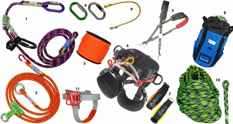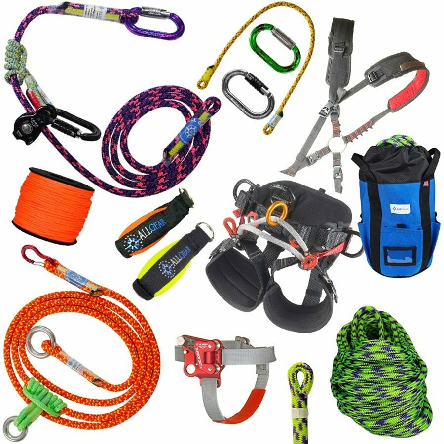 Description: ALL GEAR Expert Climbing Kit Contains The Following -11.2mm or 11.8mm x 15 foot Micro Pullly Work Positioning Lanyard. - Adjustable Friction Saver 1/2 inchx 10 foot - Jet Set throw line 1.75 x 180 feet - Tree Access ANSI ST Climbing Saddle -Tree Access SRT Chest Harness -Triple Action Aluminum Carabiners - Throw Bags - Rope Bag - 10mm Prusik Eye to Eye - 11.8mm x 200 foot 24-Strand Climbing Line with Spliced Eye and a Turbofoot Ascender Right or Left.