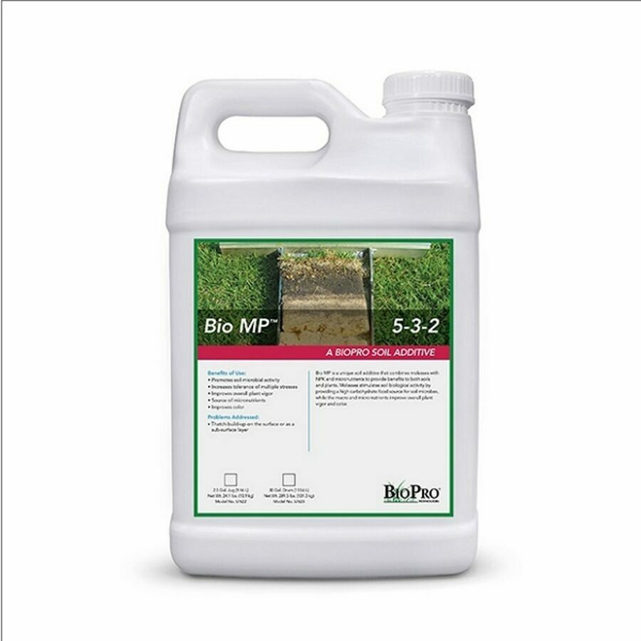 Description: Bio MP is a high carbohydrate, molasses-based soil conditioner designed to stimulate biological activity by providing an immediately available energy source. Bio MP is particularly well suited for soils with thatch layers, soils with extremely low organic matter content and soils with anaerobic conditions caused by compaction. Improved biological activity helps improve natural nutrient availability in the soil.