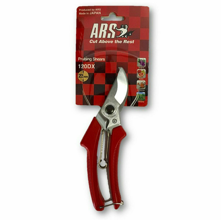 Description: ARS DX Series Hand Pruner - HP-120DX. Hard chrome plated, wipe clean blades. Japanese style v-spring and comfortable grip.
