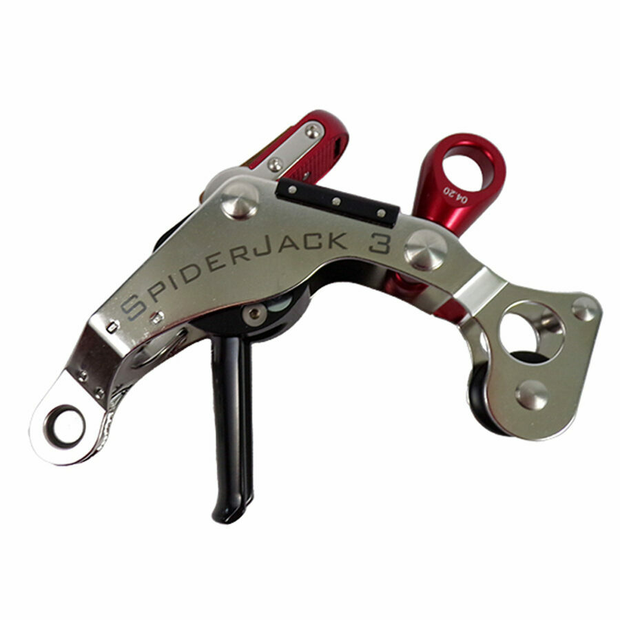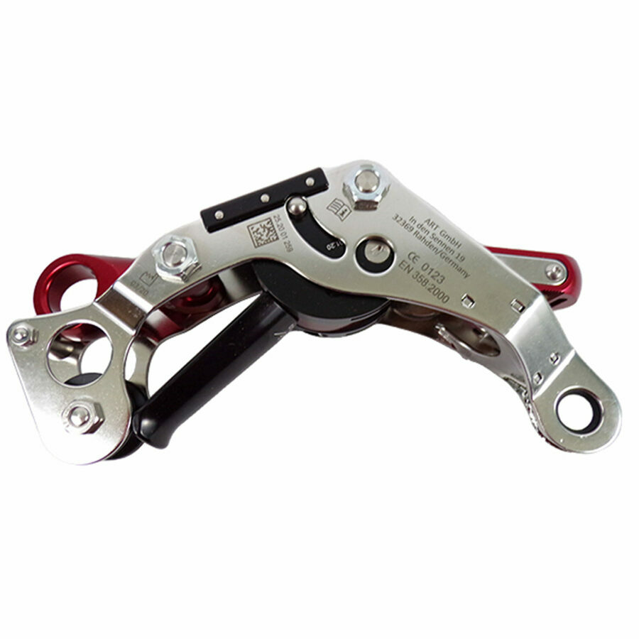 Description: Multifunctional, self-blocking rope control device for the running double rope. The working side of the rope (DDRT) is directly in front of the climber so it is possible to pull and feed the rope very comfortable with one hand or hand over hand into the device. Turning it in the releasing position and pressing the thumb brake needs very little force.