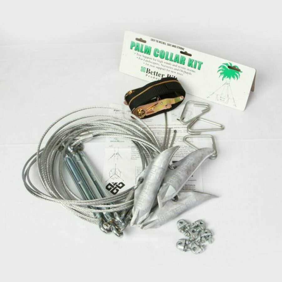 Details: Package Contents 1 Tree Kit: 3 anchors with attached 15' galvanized steel cable, 1 palm collar (2" webbing, rachet, 3 triangle self-locking rings), 6 cable clamps, 3 turnbuckles