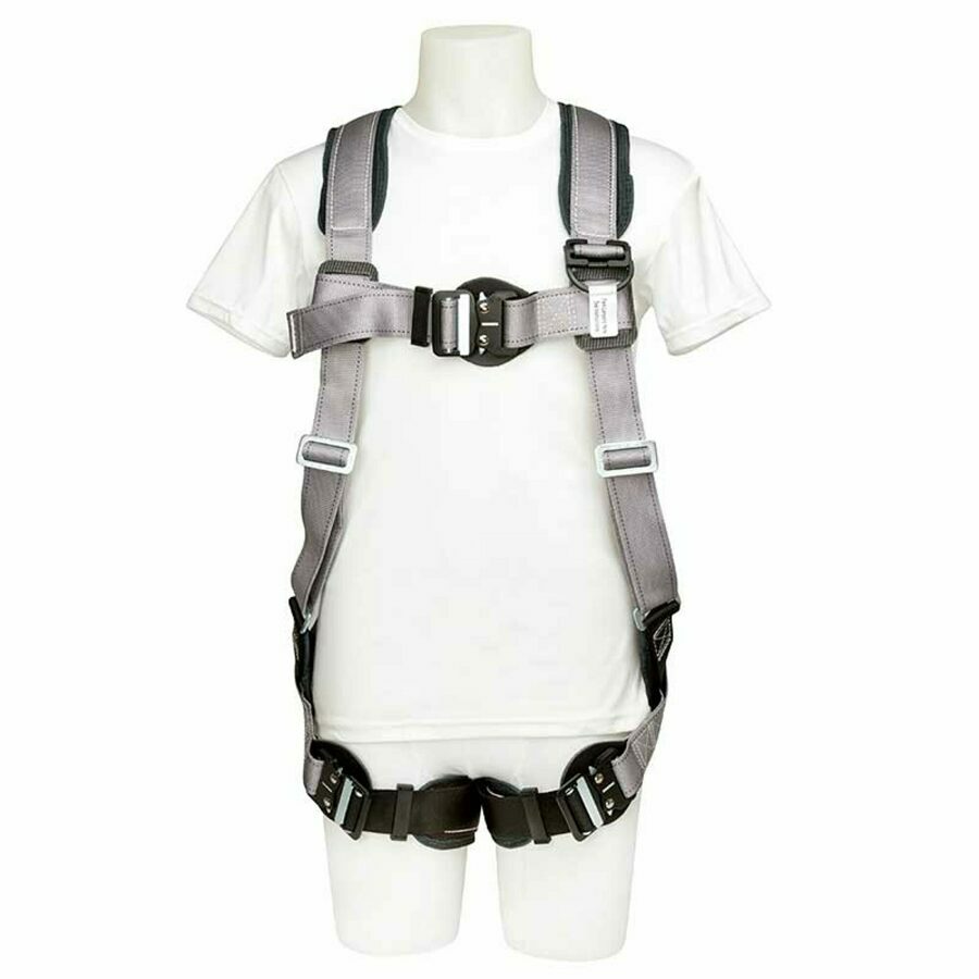 This harness has a web dorsal loop attachment and friction buckle mounted on vertical shoulder strap for height adjustments.