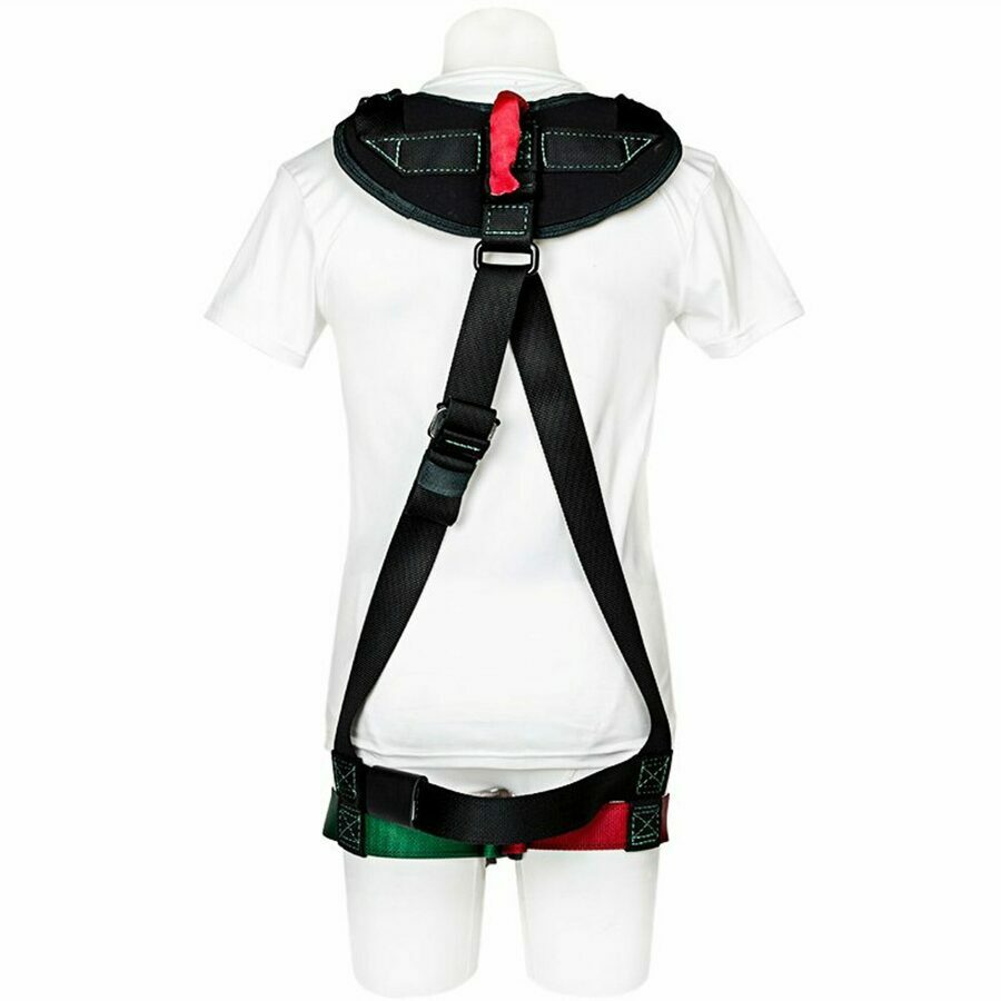Details: Three 5,000 lb. rated dee rings in the front of the harness, two at the sternum (better for rescue), one at the abdomen, and a 5000 lb. rated Nylon loop dorsal attachment that can be used for fall arrest or rescue.