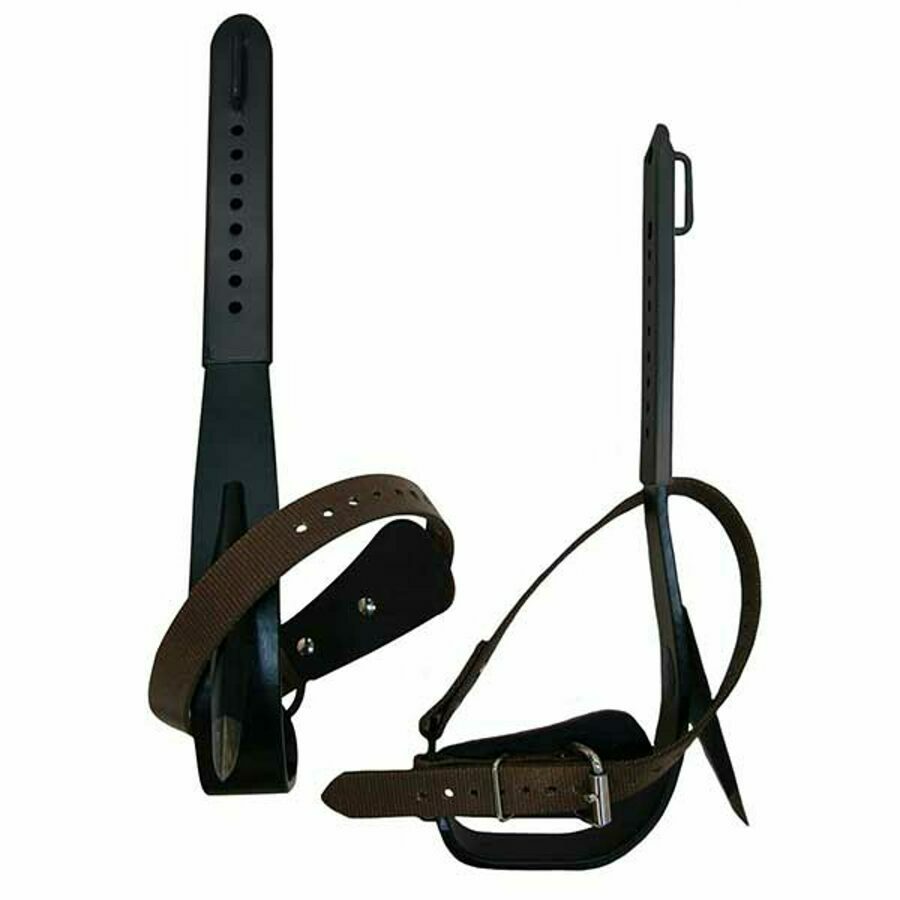 Description: Popular choice steel tree climber that offers a contoured shank, permanent gaff, and a ring style straight stirrup. With Permanent Gaff, Straight Stirrup, Pads, Upper and Lower straps