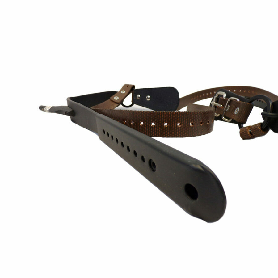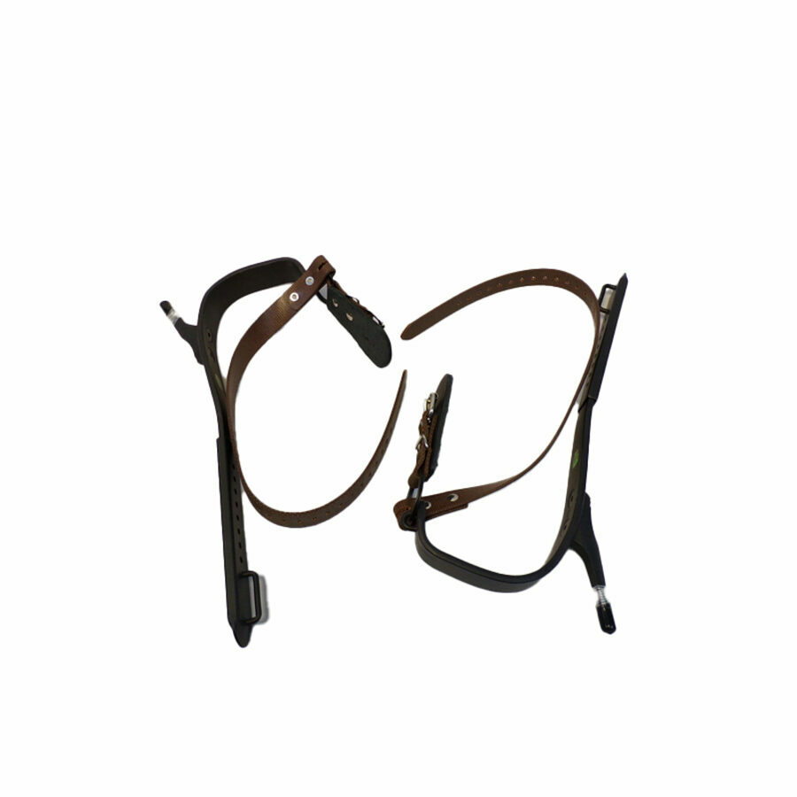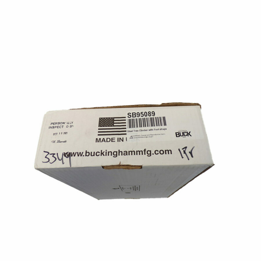 Description: Buckingham Steel Tree Climber with Foot straps A steel tree climber that has a contoured shank, offset stirrup, and dowel and screw style replaceable gaff.