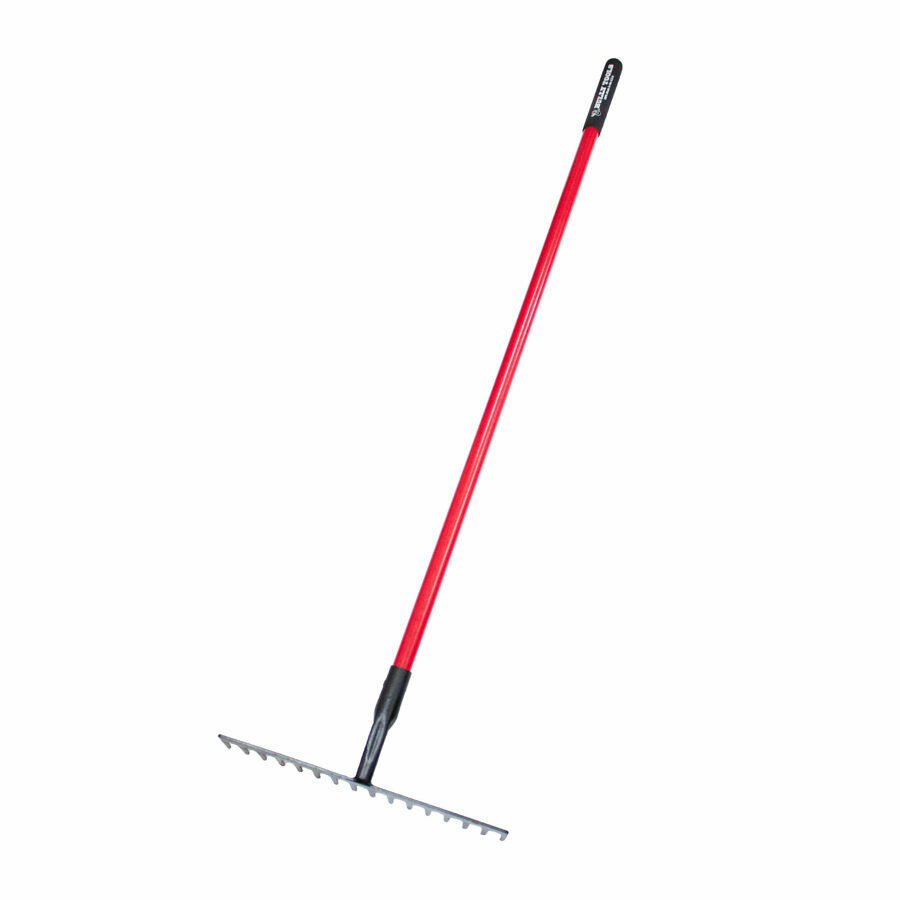 Description: he Bully Tools 92369 18″ Stone Rake with Long Fiberglass Handle is the perfect landscaping tool for projects involving spreading stones, gravel, tough soil, mulch, and other debris for various lawn & garden tasks. It is constructed from a heavy duty 7-gauge 100% Made In The USA steel, which is up to 30% more durable than foreign competitors, a 58″ handle made from high quality fiberglass and coated in a polyester veil to prevent splintering and increase strength, and a rubber grip to provide maximum comfort and to decrease hand fatigue through extended use. The Bully Tools 18″ Stone Rake with Long Fiberglass Handle also comes with a limited lifetime warranty that protects against defects in material and workmanship.