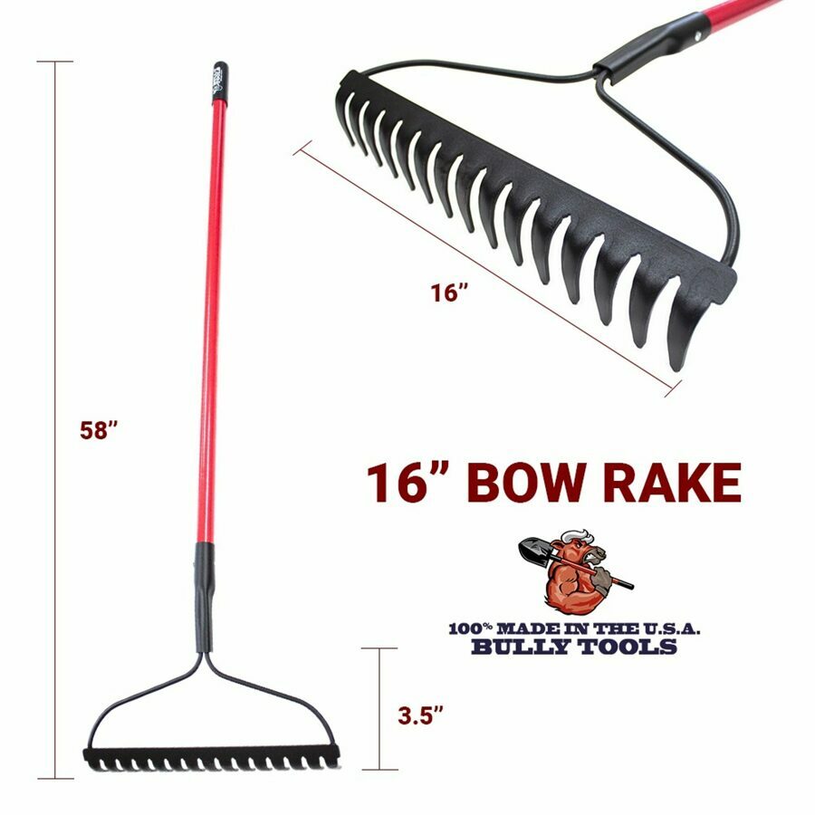 Description: The best rake for any serious yard and garden job, our Bow Rake can handle anything from dirt, to mulch, to rocks. The Bow Rake is an essential tool for all gardens because of its versatility: smoothing soil, breaking up dirt, raking debris, leveling mulch, moving rocks, and much more. Its heavy-duty construction with ribbed teeth and reinforced ridges makes it possible for you to break up even the most compacted soil. Its specially designed rake-head indentations help you scoop more material with each individual tine. Since the head is welded to the handle and the steel components are over-welded, the Bow Rake won’t separate no matter how tough your garden project—no simple wood-handled big-box rake can boast that. This might be the last bow rake you will ever need to buy. Constructed with heavy duty 10-gauge 100% Made In The USA steel, it’s up to 30% more durable than foreign competitors, and the handle is made from high quality fiberglass and coated in a polyester veil to prevent splintering and increase strength, plus a rubber grip to for the most comfort handle while on the job. The Bully Tools 16″ Bow Rake with Fiberglass Handle comes with a limited lifetime warranty that protects against defects in material and workmanship.