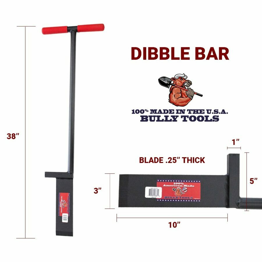 Description: Speed up the planting process with the Dibble Bar. The perfect tool for rapidly planting tree saplings in bulk, it was designed ergonomically to prevent back pain and be easy to use. The strong blade slides through soil, dirt, and roots, while the handle and footstep allow you to apply even pressure as you push the earth to the side for effortless planting. This means no digging holes and the resulting plant/dirt sinks you have to fix later, saving you even more time. Constructed from 100% Made In The USA steel, the Dibble Bar is up to 30% more durable against foreign competitors. It’s designed with a T-Styled handle with rubber grips for maximum comfort, and to decrease hand fatigue throughout extended use. The Bully Tools All Steel Dibble Bar with T-Style Handle comes with a limited lifetime warranty that protects against defects in material and workmanship.