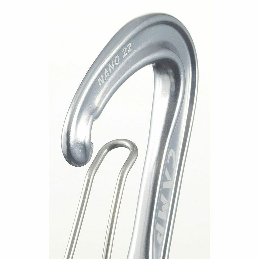 Description: The evolution of the Nano continues. Following the popular Nano Wire and Nano 23, the new Nano 22 is even lighter, stronger, and more functional. The Nano 22 features a completely new design with a stronger open gate strength, a deeper basket for holding the rope in its proper position, and a refined gate for smooth, easy clipping. At 22 grams, the Nano 22 is the lightest fully-functional carabiner on the market with unique attributes that set it apart from other smaller carabiners. Like an inner working space large enough to use a clove hitch with ropes of any diameter, a gate opening wide enough for easy clipping on the sharp end, a profiled nose that slips in and out of tight chain links, and 8 colors for racking cams. As the trend towards lighter and faster, bigger and bolder continues, the Nano continues to set the standard for carabiners in the area of lightweight functionality.