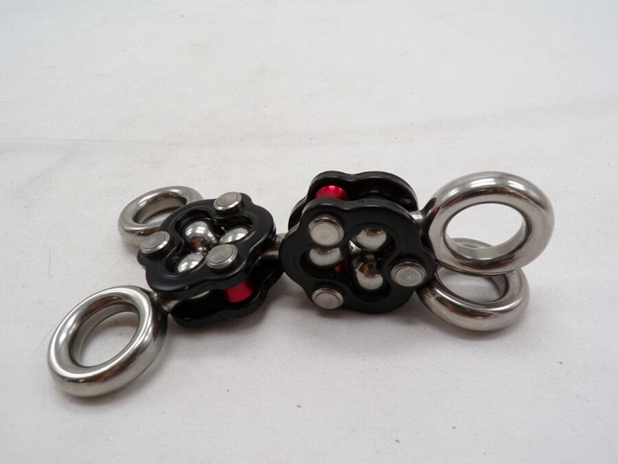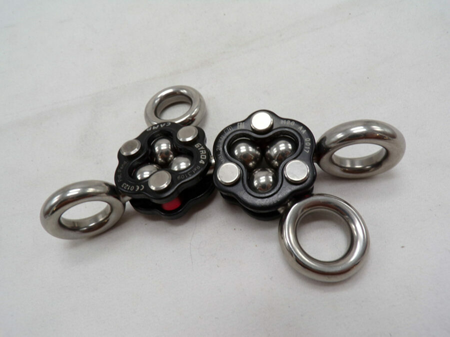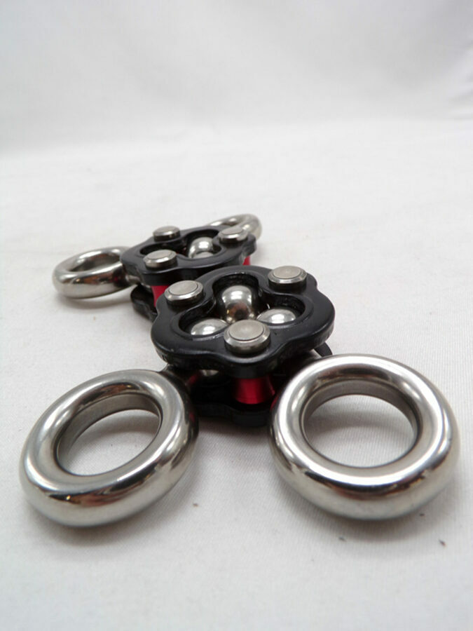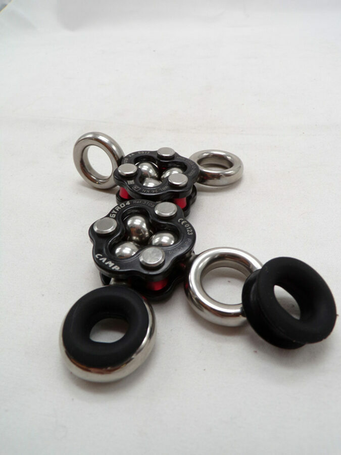 Description: A revolutionary 3D swiveling rigging plate equipped with 4 connection points that rotate independently to allow them to be self-orienting even in the most complex rigging scenarios. The patented Gyro system allows for countless possibilities of connection between different elements that need freedom of movement. The innovative design prevents the accumulation of dirt and makes inspection easy. Main structural flanges are carbon steel with a double corrosion preventive coating. Swivel balls and attachment points are stainless steel. Includes four removeable silicon anti-rotation inserts. Working load limit: 3 kN. Minimum breaking strength: 26 kN. Working load limit and minimum breaking strength are doubled when the two main bodies are oriented horizontally.