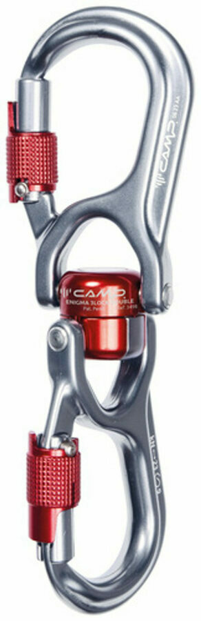 Description: The Enigma 3Lock Double integrates two triple lock carabiners and a swivel in a single device for quick and compact connections that can both pivot and tilt. Ball bearings inside the swivel guarantee high load efficiency and do not require maintenance. The pivoting connections of the two carabiners allow for a great range of orientations and movements. The unique design opens the swivel with a single screw (key provided with product). The safety locking system is independent and opposite to the working direction of the device for safe and easy assembly. Constructed completely from aluminum alloy and stainless steel for a very high breaking strength (23 kN) and a high working load limit (5 kN). D