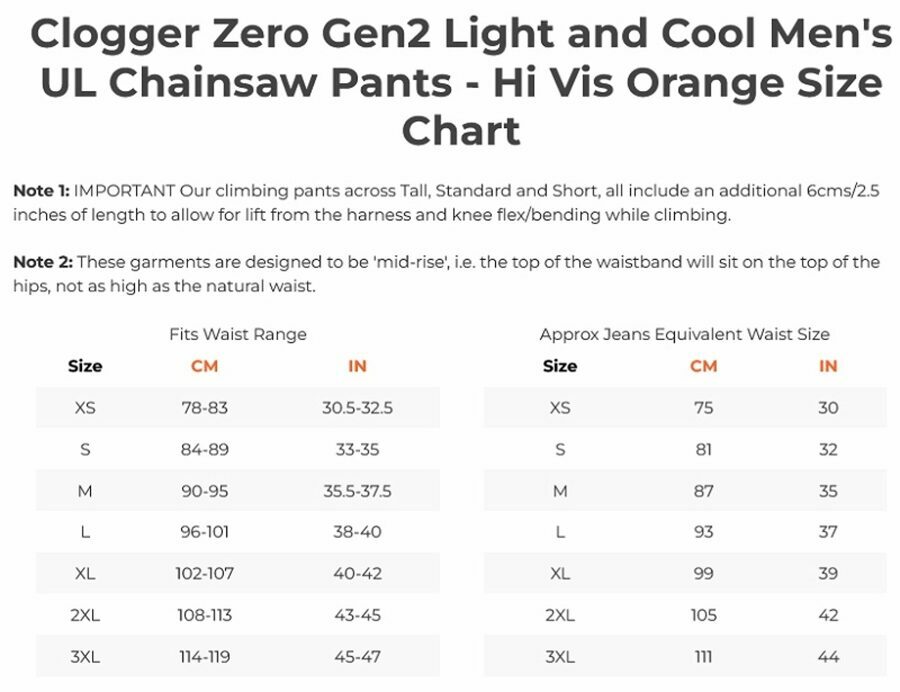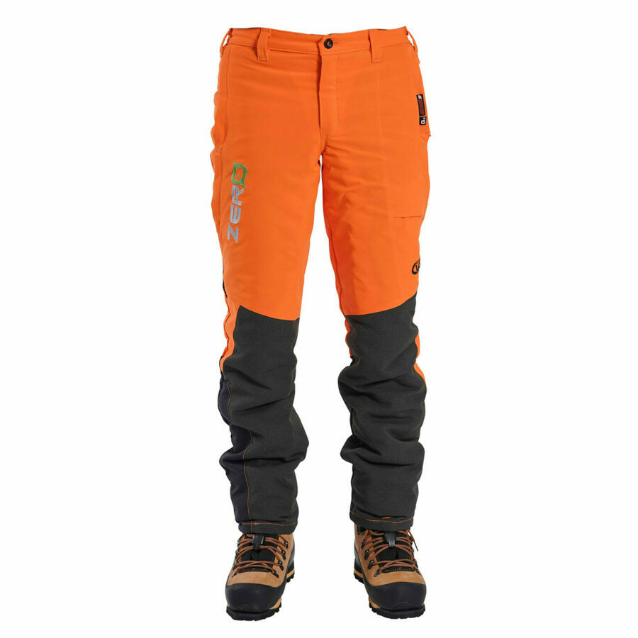 Description: The first generation of the Zero has been a game changer for the industry. The first lightweight, cool chainsaw pants. With Zero, you don’t sweat all day long when you are climbing. The new Zero does the same as his older brother. But better. Like the original, it embraces your movements: you are able to stretch, climb and jump freely. With the Gen2, you get a number of improvements from tougher zips and an elasticized seat seam for extra give through to an ultra tough rear pad to prevent tears from your hanging chainsaw. Of course, Zero's fit and style stays the same. You will look good in the trees… or on the ground. The Hi Vis Orange model take visibility to a new level. This option has 360 calf wrap for additional protection.