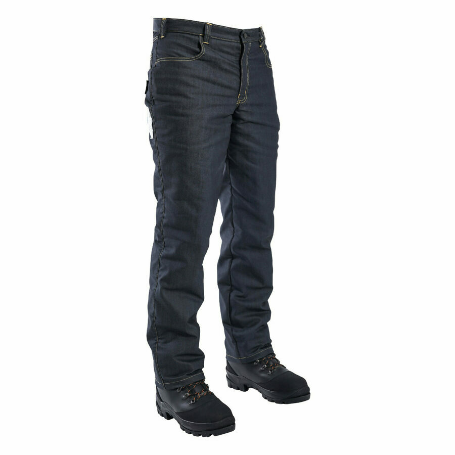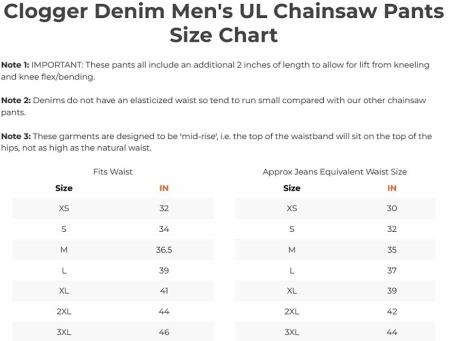 Description: Are you sick of the power ranger look and want chainsaw protection that ticks all the safety boxes while remaining both comfortable and casual looking? Introducing Denim from Clogger. Clogger's first chainsaw protective pant designed for a more traditional, laid back look. Clogger Denims are lightweight (2 lb 3 oz - size medium) with stretch that is flexible and easy to work in. Note: Denims do not have an elasticized waist so tend to run small compared with other chainsaw pants.