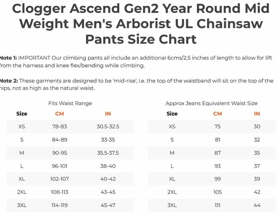 Description: If you think Zeros are great then you'll love Ascends. The all new Ascend Gen2 chainsaw pants builds on a Clogger classic with a new streamlined, lighter design and ultra durable construction. This true seasonal pant for the cooler months offers ultra durable construction, water-resistant coverage and a high-back waist design.