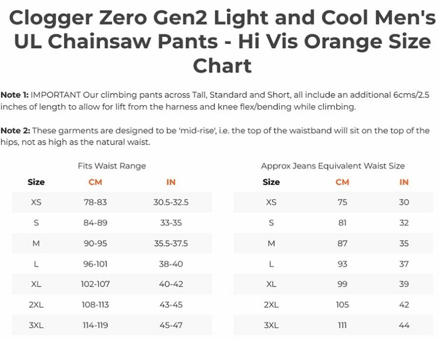 Description: The first generation of the Zero has been a game changer for the industry. The first lightweight, cool chainsaw pants. With Zero, you don’t sweat all day long when you are climbing. The new Zero does the same as his older brother. But better. Like the original, it embraces your movements: you are able to stretch, climb and jump freely. With the Gen2, you get a number of improvements from tougher zips and an elasticized seat seam for extra give through to an ultra tough rear pad to prevent tears from your hanging chainsaw. Of course, Zero's fit and style stays the same. You will look good in the trees… or on the ground. The Hi Vis Orange model take visibility to a new level.