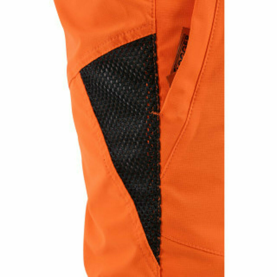 High-tenacity high vis orange polyester outer with 4-way stretch fabric for greater freedom of movement and flexibility with FlexZone in the seat seam for extra give.