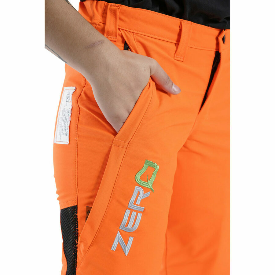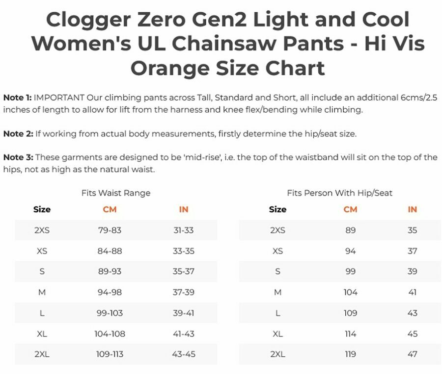 Description: The first generation of the Zero has been a game changer for the industry. The first lightweight, cool chainsaw pants. With Zero, you don’t sweat all day long when you are climbing. The new Zero does the same as his older brother. But better. Like the original, it embraces your movements: you are able to stretch, climb and jump freely. With the Gen2, you get a number of improvements from tougher zips and an elasticized seat seam for extra give through to an ultra tough rear pad to prevent tears from your hanging chainsaw. Of course, Zero's fit and style stays the same. You will look good in the trees… or on the ground. The Hi Vis Orange model take visibility to a new level. Women's fit Clogger pants have a larger waist to hip proportion, a higher waist with an increased rise and longer leg lengths relative to the waist compared with the men's fit.