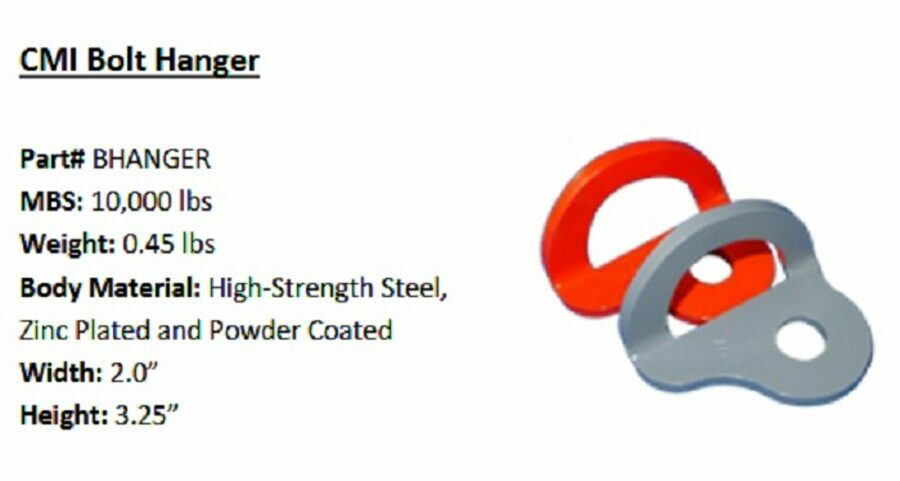 Description: CMI Bolt hangers were originally designed to be used in the ropes course market to be fastened to a tree or pole with a 5/8" lag screw. The larger than normal size helps to facilitate tree overgrowth and allow extra time to keep using the hanger. They are not to be used for climbing or slacklining. One quarter inch thick steel is plated in a clear chromate solution to prevent rust before being powedercoated in an aesthetically pleasing grey.