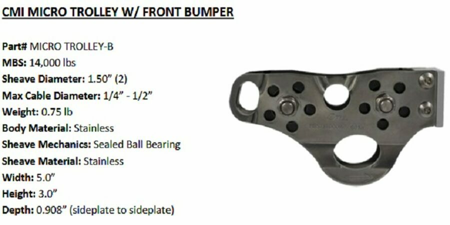Details: Stainless steel sideplates, two 1 1/2" stainless steel sheaves, ball bearings, and stainless steel axle. Max Speed = 90 ft/sec or 60 MPH