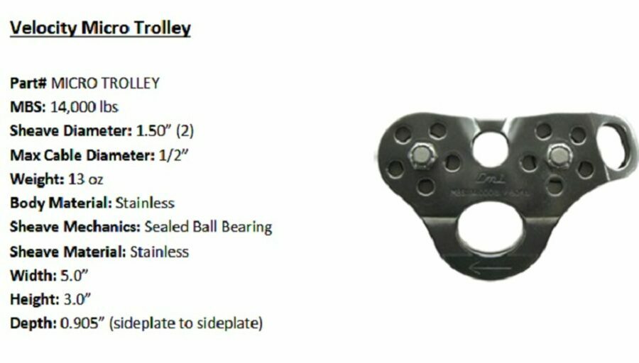 Description: CMI Micro Trolley Pulley is a smaller version of the Heavy Duty Trolleys made by CMI. This high quality trolley will work on up to 1/2" rope and cable. It features two 1-1/2" stainless steel sheaves that are on ball bearing along with a stainless steel axle.
