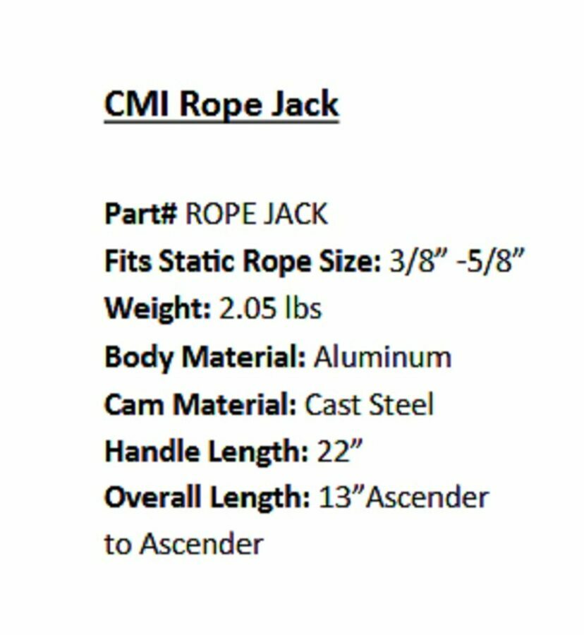 Description: The CMI Rope Jack is a Mechanical Advantage tool for pre-tensioning static lines, light lifting and cabling. The Rope Jack is small enough and light enough to be carried aloft by a climber for Mechanical Advantage within the crown. The length of the handle on the Rope Jack limits excessive loading to avoid rope damage. Under no circumstances should a cheater bar be used to increase leverage as it may damage the unit, the rope, or severely injure personnel. lt is designed to be used by only one individual using one hand only; lt shall be removed before any shock load is applied; lt shall NOT be used for heavy or dynamic loads as there are other tools available for those applications. It can attach mid-line and can run virtually any length of rope. The MA is approximately 3:1 - no pulleys, no extra rope, minimum weight, minimum friction, quick, easy on-off, works well 'topside', too. The CMI Rope Jack is used to remove slack & stretch for lowering and to lift the tips on light limbs without having to break out the big guns. It is NOT for heavy loads. Cams, even 'untoothed' like a Rescucender and Gibbs, have been shown to shred a rope with high loading. There are much better tools for the heavy work. The rope jack is approved for life support use as long as another form of progress capture device is used in conjunction with the device. Never use the Rope Jack by itself for hauling human cargo. The CMI Rope Jack is approved for static ropes from 3/8-5/8" diameters. Testing has shown that a single person can generate somewhere between 300-80O pounds of force while using the Rope Jack. Testing revealed CMI ascenders will strip the sheath of brand new 1/2" rope at roughly 1500lbs). To remove a load from the Rope Jack, pull the handle and allow the trailing cam to loosen, then pull handle again and allow the forward cam to loosen. Releasing the Rope Jack will take a little practice. The Rope Jack should be relieved from tension a little bit at a time off each cam.