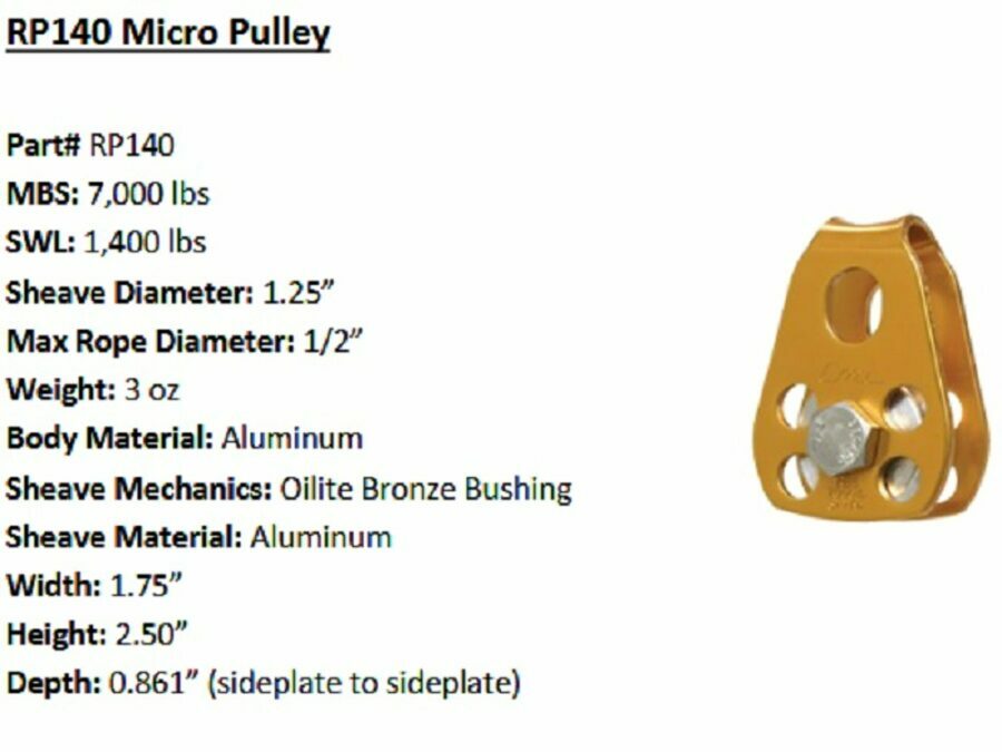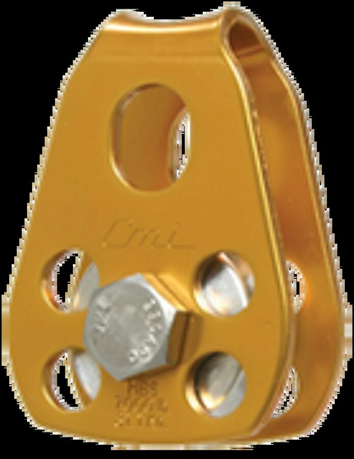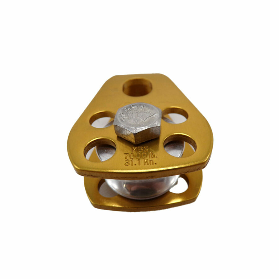 Description: Continuous sideplate allows multiple rigging options--parallel to the rope with a single oval carabiner, or perpendicular through the rigging holes. Anodized aluminum sideplates, 1 1/4" aluminum sheave,bushing, and stainless steel axle.