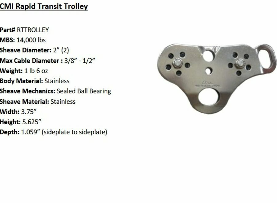 Description: Stainless steel sideplates, two 2" stainless sheaves, ball bearings, and stainless steel axle. Max Speed = 130 ft/sec or 90 MPH Oversized stainless steel sideplates extend well beyond the sheaves to protect them from hard usage. A rear slot allows a steel carabiner to surround the cable, allowing redundancy from the cable to the harness.