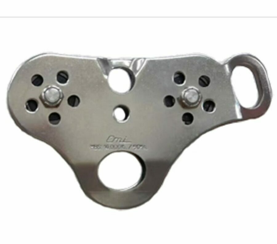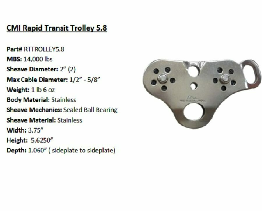 Description: Stainless steel sideplates, two 2" stainless sheaves, ball bearings, and stainless steel axle. Max Speed = 130 ft/sec or 90 MPH Oversized stainless steel sideplates extend well beyond the sheaves to protect them from hard usage. A rear slot allows a steel carabiner to surround the cable, allowing redundancy from the cable to the harness.