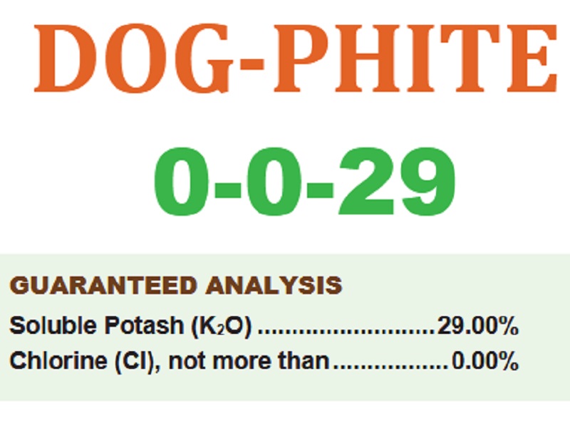 Description: GENERAL INFORMATION DOG-PHITE 0-0-29 is a concentrated foliar nutrient solution. These nutrients in their highly soluble form are beneficial to plant growth, crop development, crop quality and yield when applied as a properly timed foliar spray or soil injection. DIRECTIONS FOR USE DOG-PHITE 0-0-29 may be applied by air or with all types of ground spraying equipment. Minimum GPA: 20 GPA ground, 10 GPA air. DO NOT EXCEED a product concentration of 2% volume/volume maximum. DOG-PHITE 0-0-29 will disperse in water with minimal agitation. It can be tank mixed with most pesticides. Always make a small-scale test to assure compatibility. Follow the mixing sequence: 1. Water 2.DOG-PHITE 0-0-29 3.Pesticide or fertilizer. It is recommended to use this product with surfactants that do not lower pH. For best results, apply in early morning or late afternoon when leaf pores are open. Spray as a fine mist during periods of little dew to avoid runoff of leaf surfaces when soil injecting. Do not mix with high N fertilizers.