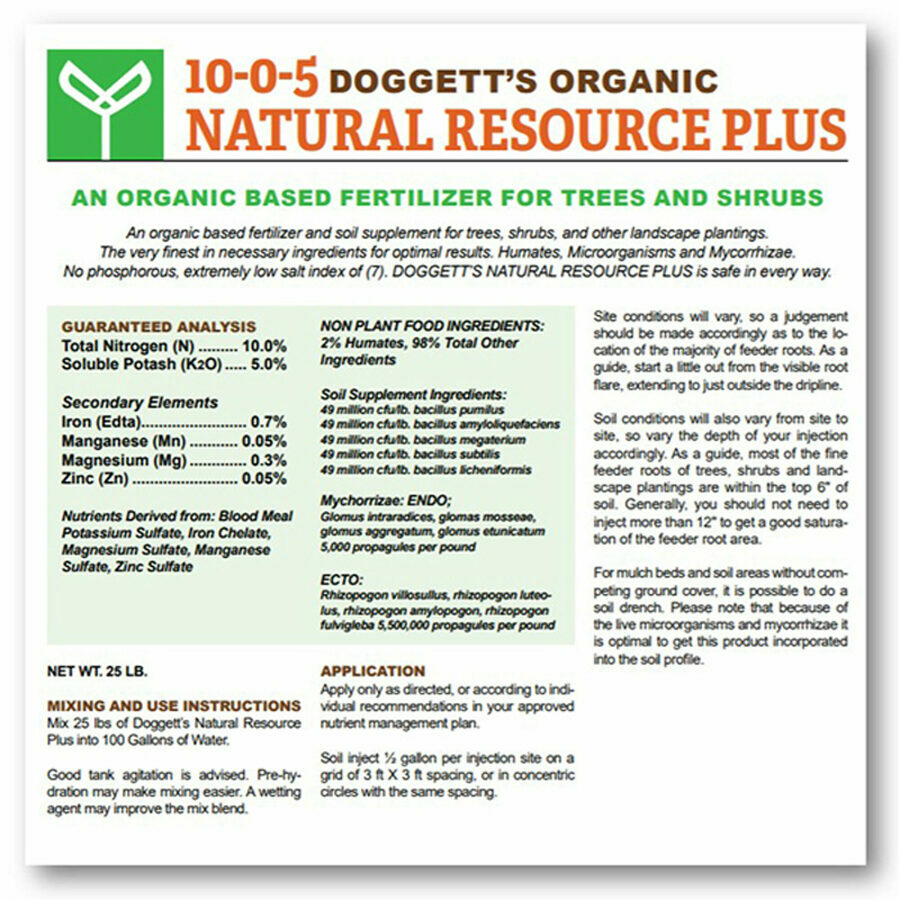Description: An organic based fertilizer and soil supplement for trees, shrubs, and other landscape plantings. The very finest in necessary ingredients for optimal results. Humates, Microorganisms and Mycorrhizae. No phosphorous, extremely low salt index of (7). DOGGETT’S NATURAL RESOURCE PLUS is safe in every way