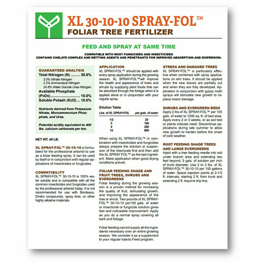 Description: FOLIAR TREE FERTILIZER XL SPRAY-FOL™ 30-10-10 is formulated for the professional arborist to use as a foliar feeding spray. It can be used by itself or in conjunction with regular applications of insecticides or fungicides