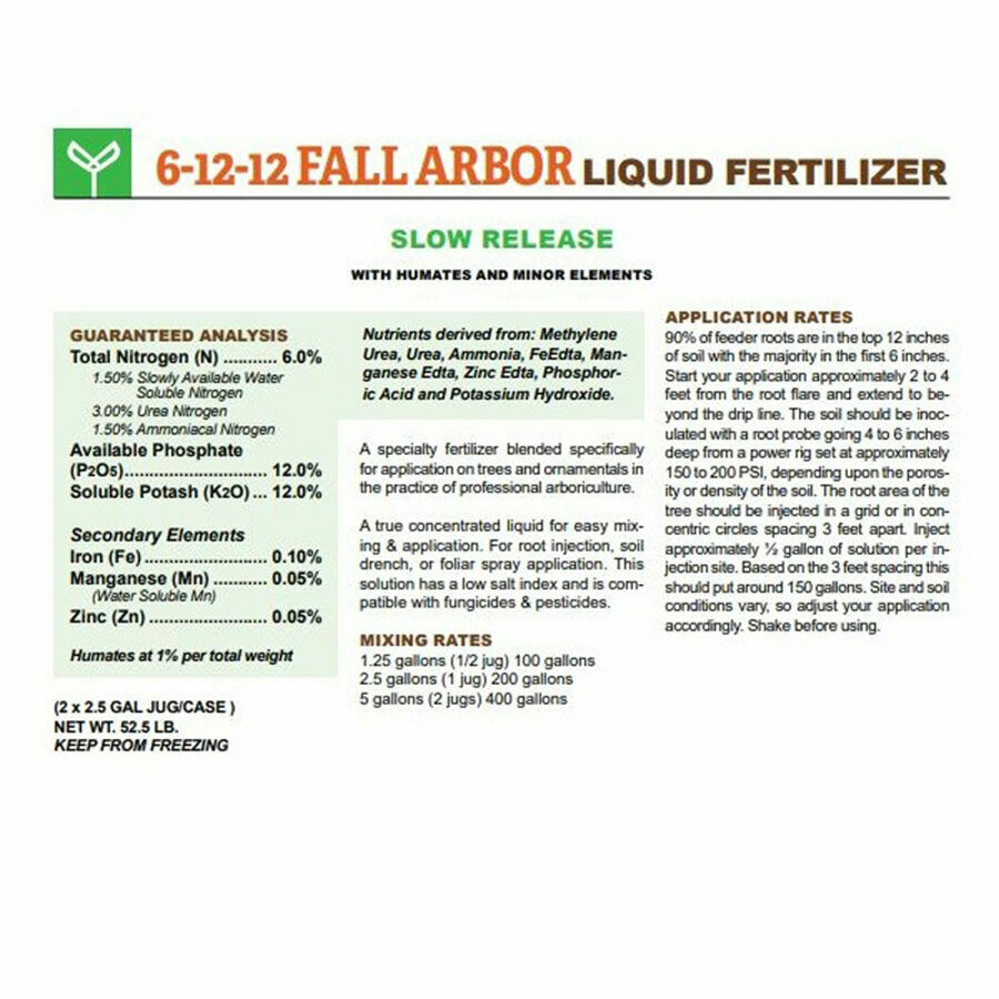 Description: Doggett 6-12-12 Fall Arbor Liquid Fertilizer - 2.5 GallonsA specialty fertilizer blended specifically for application on trees and ornamentals in the practice of professional arboriculture.A true concentrated liquid for easy mixing & application. For root injection, soil drench, or foliar spray application. This solution has a low salt index and is compatible with fungicides & pesticides. MIXING RATES 1.25 gallons (1/2 jug) 100 gallons 2.5 gallons (1 jug) 200 gallons 5 gallons (2 jugs) 400 gallons APPLICATION RATES 90% of the fine feeder roots are in the top two feet of soil, with most of those in the top eight inches. Start your application approximately 2 to 4 feet from the root flare and extend to beyond the drip line. The soil should be inoculated with a root probe going 4 to 6 inches deep from a power rig set at approximately 150 to 200 psi, depending upon the porosity or density of the soil. The root area of the tree should be injected in a grid or in concentric circles spacing 3 feet apart. Inject approximately ½ gallon of solution per injection site. Based on the 3 feet spacing this should put around 150 gallons.Site and soil conditions vary, so adjust your application accordingly. Shake before using