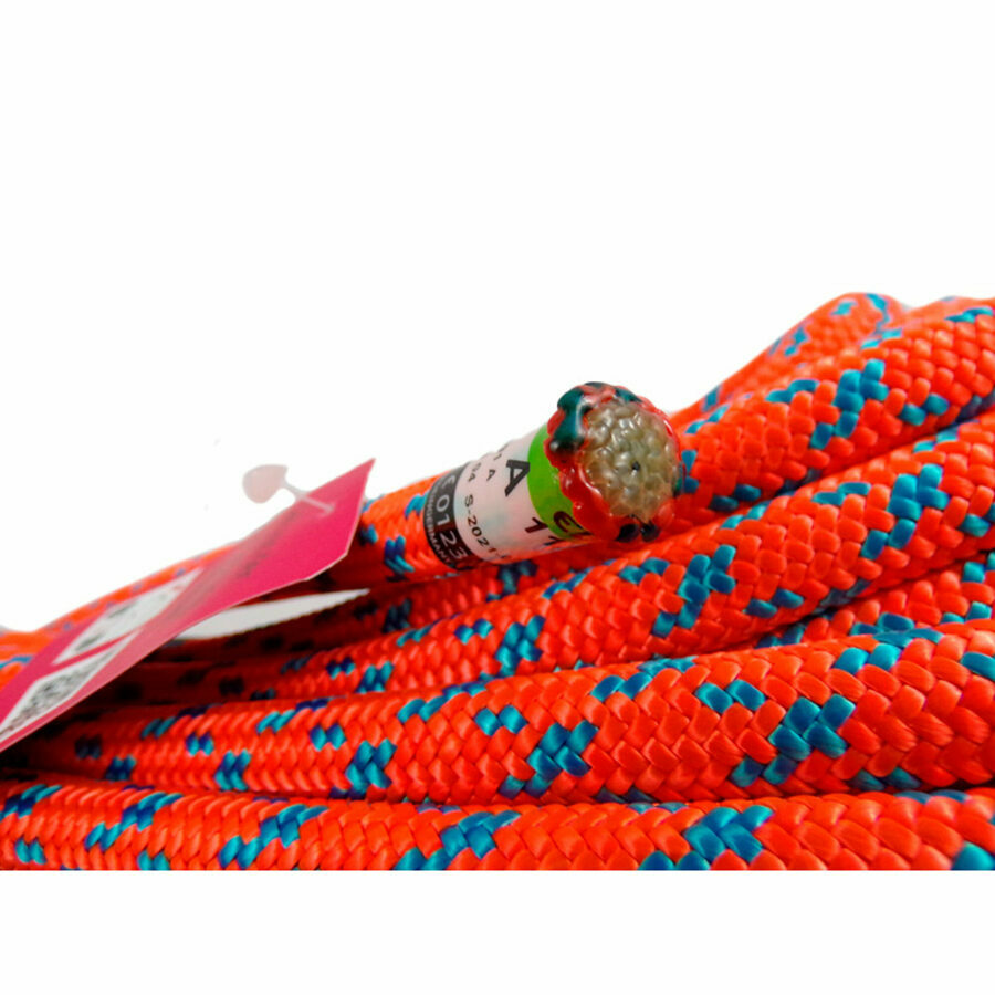 Description: Bucco 11.7mm, orange ANSI Z133 low elongation 1.9%, 32 strand sheath made of recycled polyester. Ideal for SRT. MBS 47kN High-quality and sustainable arborist rope with particularly low elongation. The BUCCO is ideal for work with ascenders and single rope technique (SRT). The sheath is made from recycled yarn. Manufactured on a braiding machine with 32 bobbins, the rope is very pleasant to handle.