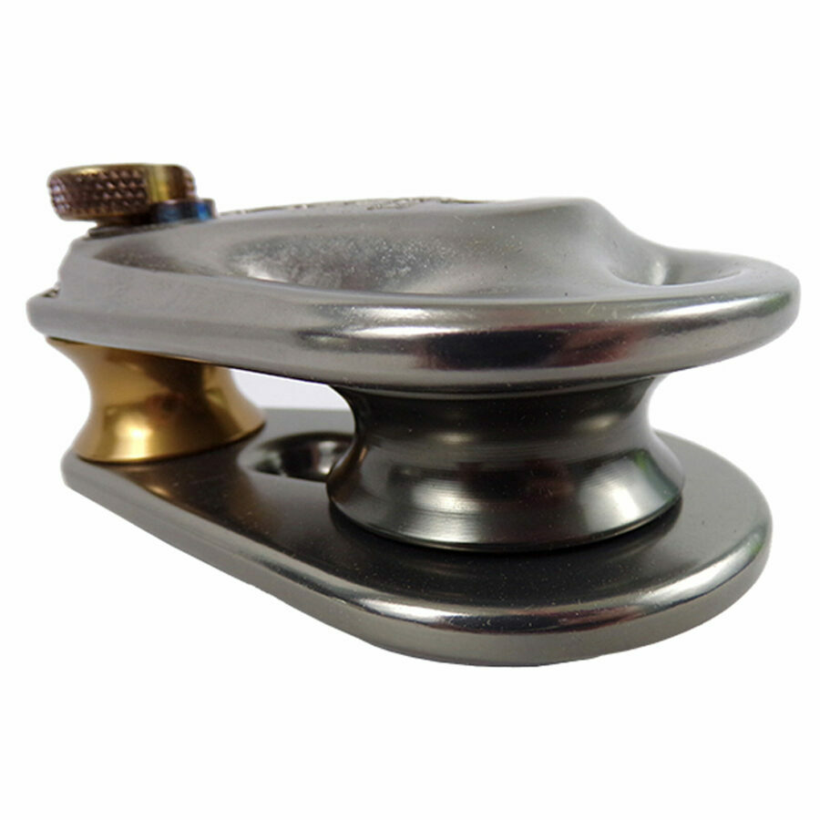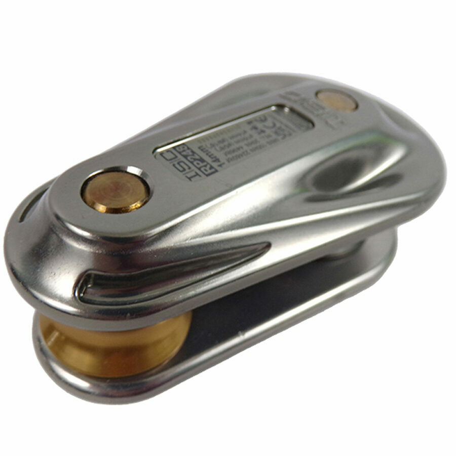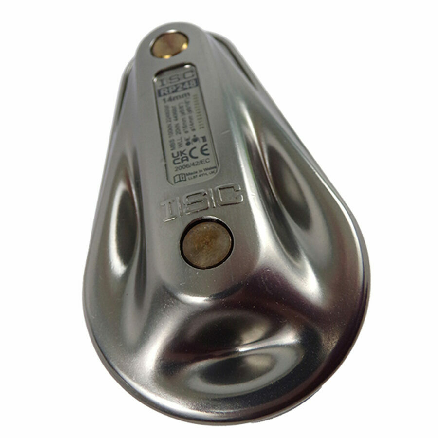 Description: The next generation ISC Rigging Pulleys are up to 150% stronger than the equivalent ISC standard Rigging Pulley models. The new low-profile Spring-lock mechanism features a new Safelock locking button to offer further security and ease of use. Simply push the Safe-lock button and turn the axle head 180° to the release position. The Safelock button can be depressed and the pinhead rotated in a continuous one-handed action. When the device is in the open position, the locking pin on the axle is retained in the correct alignment. This means that the user does t need to rotate the axle in order to correctly align the axle pin with the groove in the pulley plate, in order to close the device. Once the axle is fully depressed and the axle spring is fully compressed, the axle head must then be rotated 180° (in either direction), at which point the Safelock button engages to lock the axle head in place.