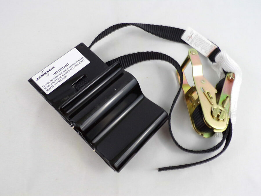 Description: The Jameson Boom Mount Chain Saw Scabbard with ratchet strap and handle holder mounts on the boom for easy access. Made from high impact plastic, Jameson's boom mount tool holders can be strapped to round or square booms. The chain saw scabbard is water repellent and UV resistant, designed to withstand extreme weather conditions. The chain saw scabbard includes a web strap with ratchet-lock clamp and handle holder to fasten tool into fixed position on the boom. The chain saw scabbard also features a rubberized liner that prevents the tool handle from sliding out of the upper holder box. Get the job done right with this chain saw scabbard!