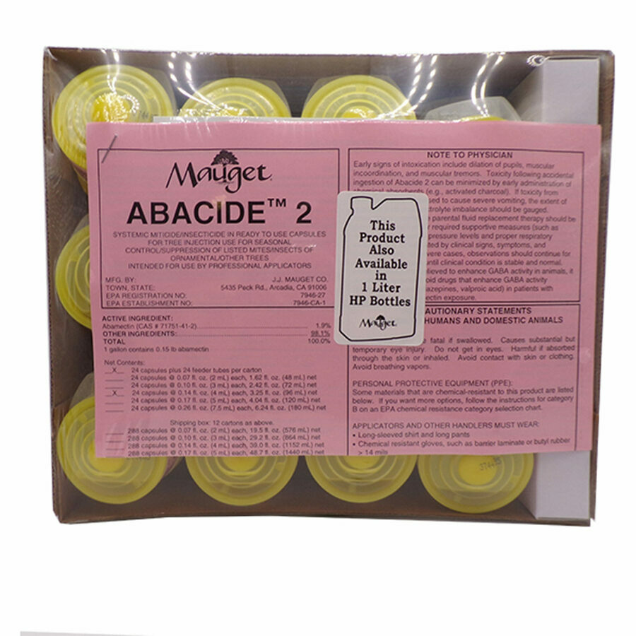 Description: Mauget’s tree injection Abacide 2 in Generation II capsules is a closed-system product containing 2 percent abamectin, a xylem phloem mobile insecticide for use on forest, woodland, Christmas, seed cone nurseries/orchards, and ornamental trees. Abacide 2 can also be used in residential or public areas such as parks, golf courses, cemeteries, schools, street tree plantings and interior landscaping. Abacide 2 tree injection insecticide provides superior management options for difficult to control phloem-feeding insects with a single application. Abacide 2 late summer or fall applications provide excellent control of conifer bark beetles the following spring with options of single or 2 year management.