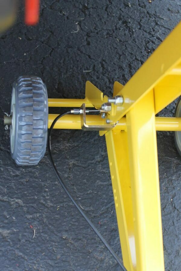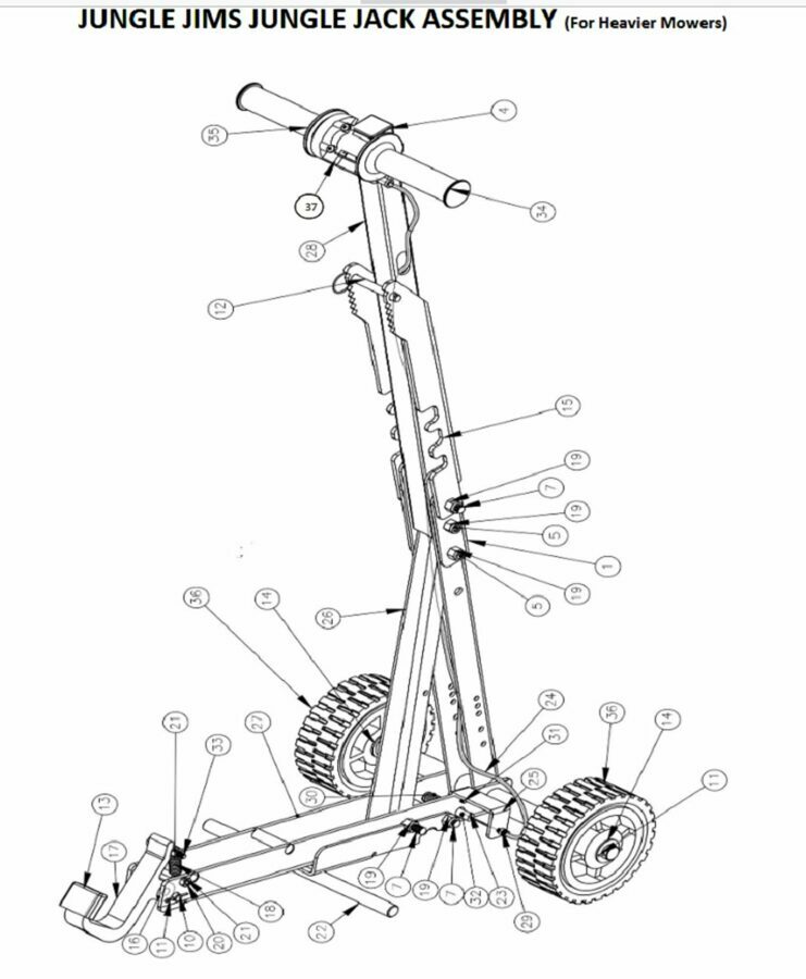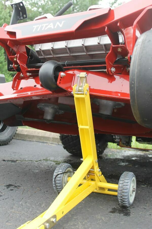 Description: Lift commercial mowers front or rear in 20 seconds!! The Jungle Jack from Jungle Jim’s now gives you the ability to lift virtually any size commercial mower with ease. Both the front or rear of any mower can be picked up by the Jungle Jack to help you perform all your maintenance duties. The Jungle Jack not only has bigger tires, but also a large foot assist for heavier mowers