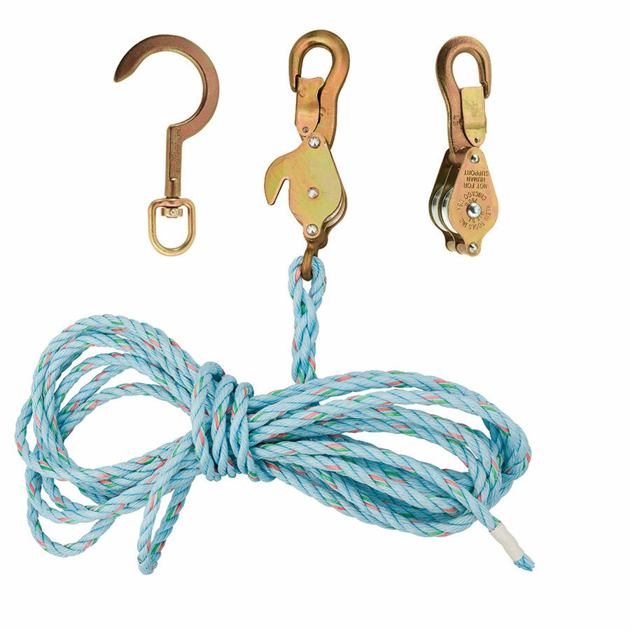 Description: All Klein block and tackle use high-quality, 3/8-Inch (10 mm) diameter rope. Light, galvanized-steel shell blocks are fitted with snubbing hooks to hold the load. This package features two blocks with a swival Klein hook Cat. No. 259 with a maximum safe load of 750-pound (340 kg).