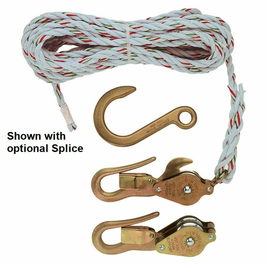 Description: All Klein block and tackle use high-quality, 3/8-Inch (10 mm) diameter rope. Light, galvanized-steel shell blocks are fitted with snubbing hooks to hold the load. This package features two blocks with a forged standard Klein hook Cat. No. 258 with a maximum safe load is 750-pound (340 kg).