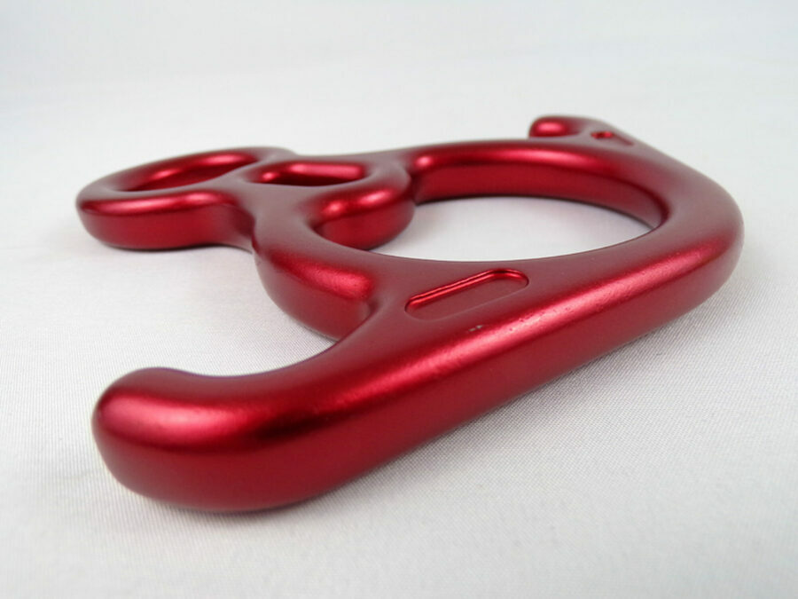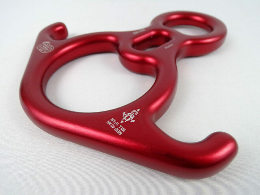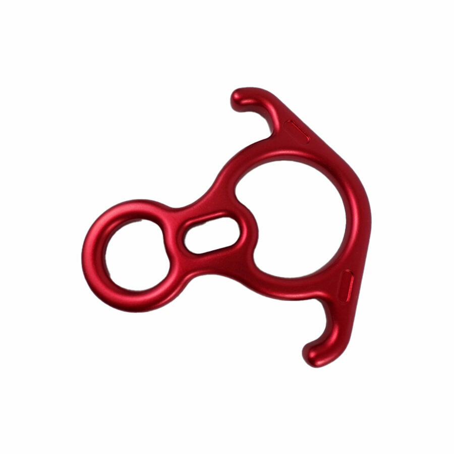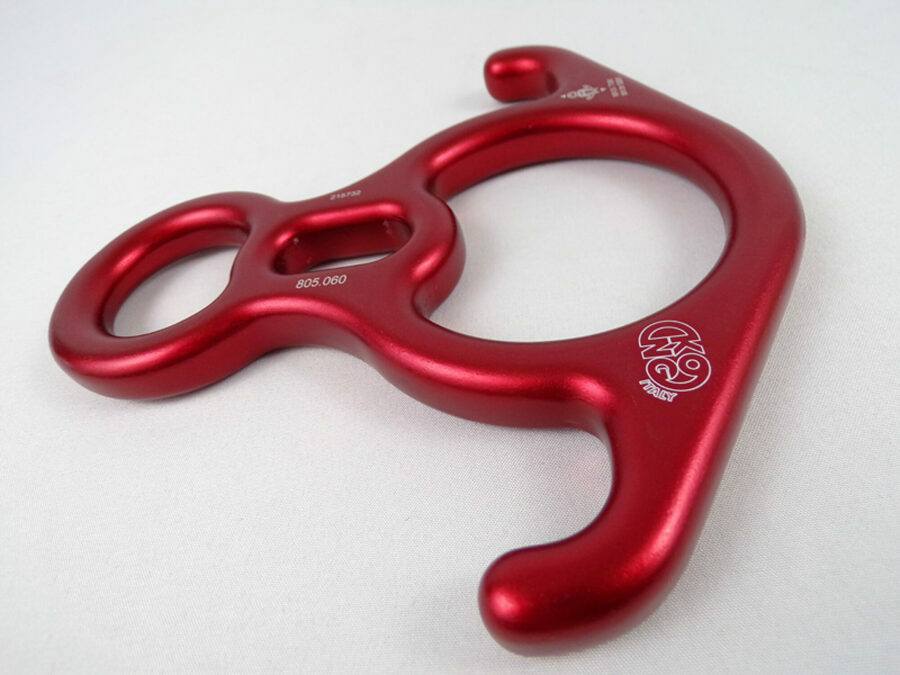 Details: Kong's Figure 8 Descender with ears (or wings) to create a locking knot. The ears are designed to prevent the rope from slipping up to the top and forming a girth hitch which can strand the climber who is rappelling until they can remove their weight from the device. The large central opening allows you to overcome any knots on the ropes.