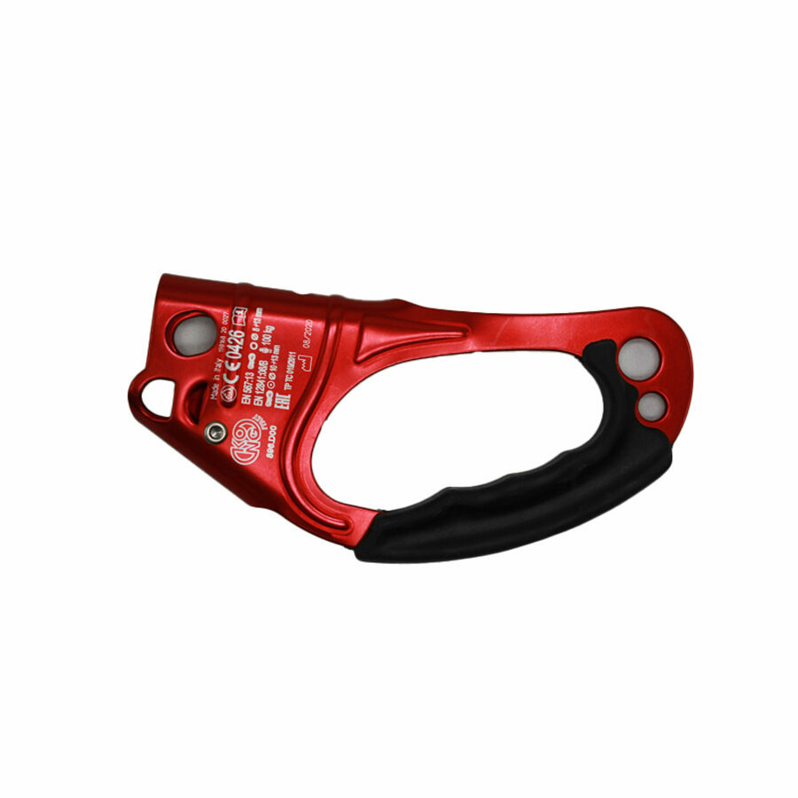 Description: Rope clamp for rope access, available in left and right versions. All the components are part of the latest generation of Kong blockers. Excellent ability to block out particularly on muddy and icy ropes thanks to the holes on the cam and on the side plate. The new material and a special chemical and thermal process give to the cam, in addition to black color, a much higher surface hardness. The result is a great wear resistance and a reduction of the fragility that usually penalizes steels by quenching to low temperatures.