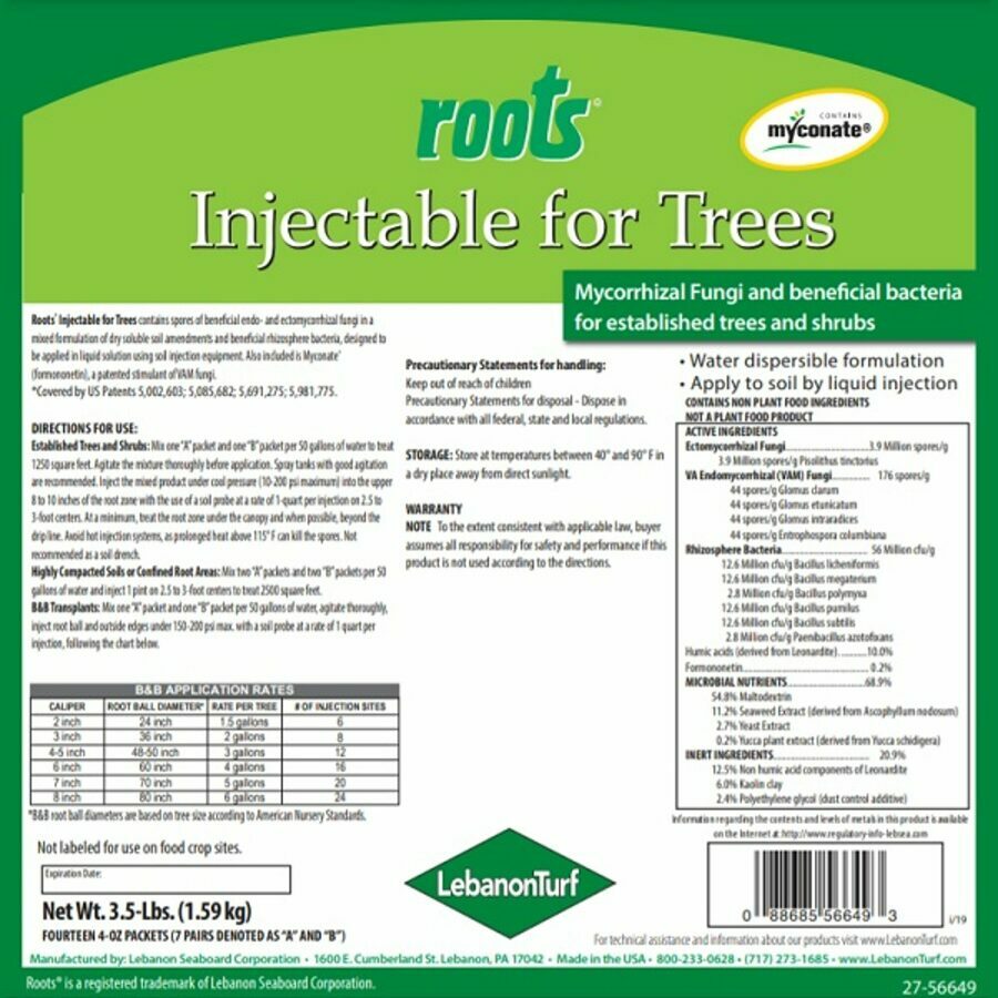 Description: Roots® Injectable for Trees contains spores of beneficial endo and ectomycorrhizal fungi in a mixed formulation of dry soluble soil amendments and beneficial rhizosphere bacteria, designed to be applied in liquid solution using soil injection equipment. Also included is Myconate® (formononetin), a patented stimulant of VAM fungi. A water dispersible inoculant containing beneficial bacteria and mycorrhizal fungi. For soil injection programs for trees and shrubs.