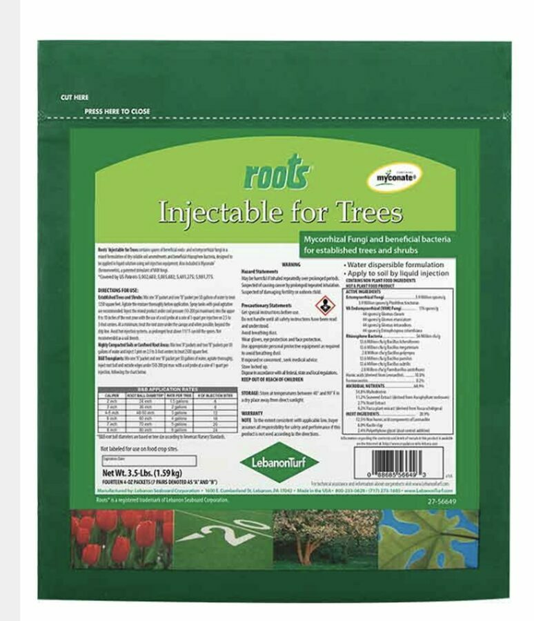 Description: Roots®Injectable for Trees contains spores of beneficial endo and ectomycorrhizal fungi in a mixed formulation of dry soluble soil amendments and beneficial rhizosphere bacteria, designed to be applied in liquid solution using soil injection equipment. Also included is Myconate®(formononetin), a patented stimulant of VAM fungi. A water dispersible inocculant containing beneficial bacteria and mycorrhizal fungi. For soil injection programs for trees and shrubs.