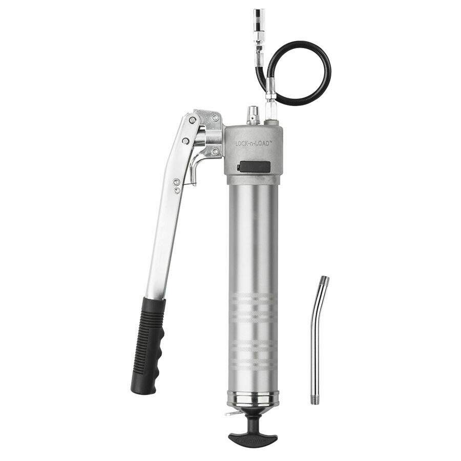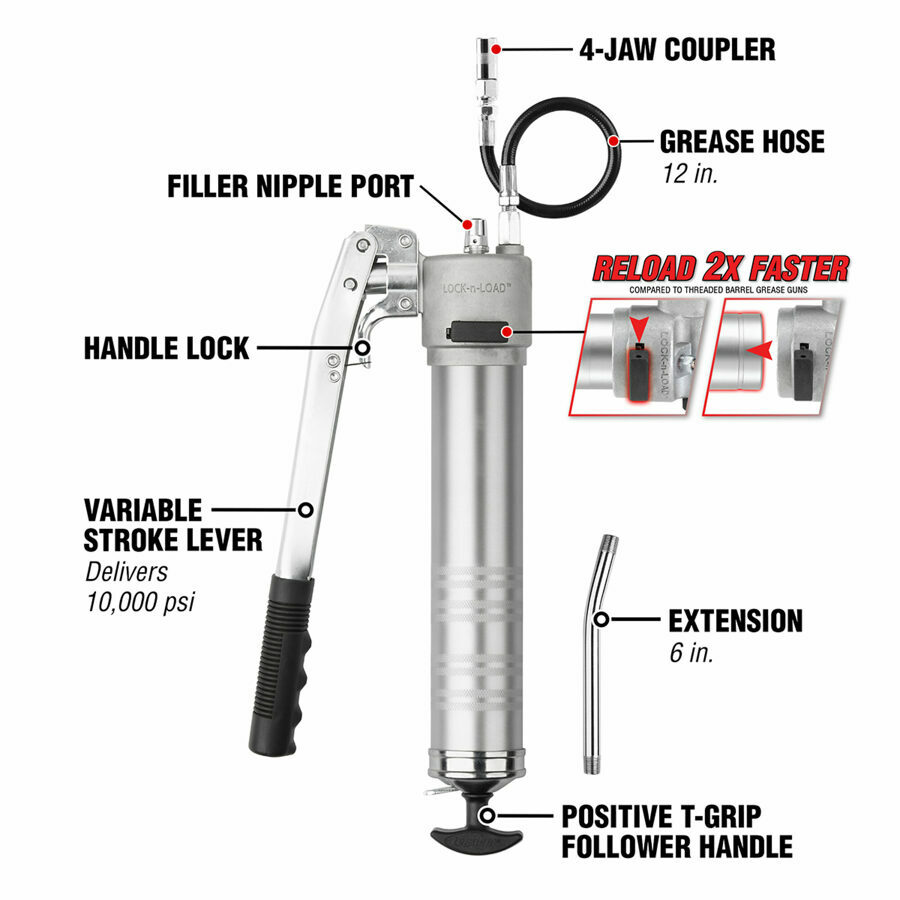 Features: Lock-n-Load™ threadless quick connect barrel allows you to reload grease in half the time compared to other grease guns Automatic Bleeder Valve - Bleeds air when reconnecting barrel to head. Reduces air locks and priming problems Protected Piston and Smooth Action Lever - The unique roller glide piston provides a low friction lever action. By not pinning the lever to the piston like the competition, damage to the piston is prevented if the gun is dropped. Heavy-duty Die-cast Head Construction - For maximum durability and longer service life 3-Way Loading - Cartridge, bulk, filler nipple Lightweight Aluminum Barrel with Firm Grip Knurling - For better grip and durability Ergonomic T-grip follower handle Delivers up to 10,000 psi Handle fully extended to 45° permits use in tight spaces and achieves 10,000 psi Reinforced handle to withstand demanding environments and rough handling Spring loaded handle to facilitate one handed operation Handle Lock – Prevents discharge of grease during storage or when working in tight spaces. During use, lock can be stored in handle Includes: 4-Jaw coupler for better grip and longer service life, 12 in. flexible grease hose and 6 in. angled extension Holds 14 oz. grease cartridge Strokes per ounce = 26