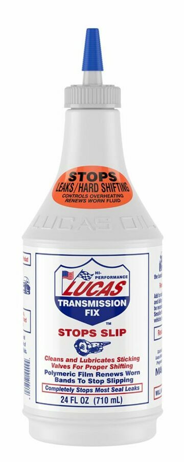 Description: Lucas Transmission Fix is a non-solvent formula that stops slip, hesitation and rough shifting in worn transmissions and completely eliminates most seal leaks. Use in any transmission for preventative maintenance. Use also in light duty manual transmissions to increase shifting ease and transmission life.